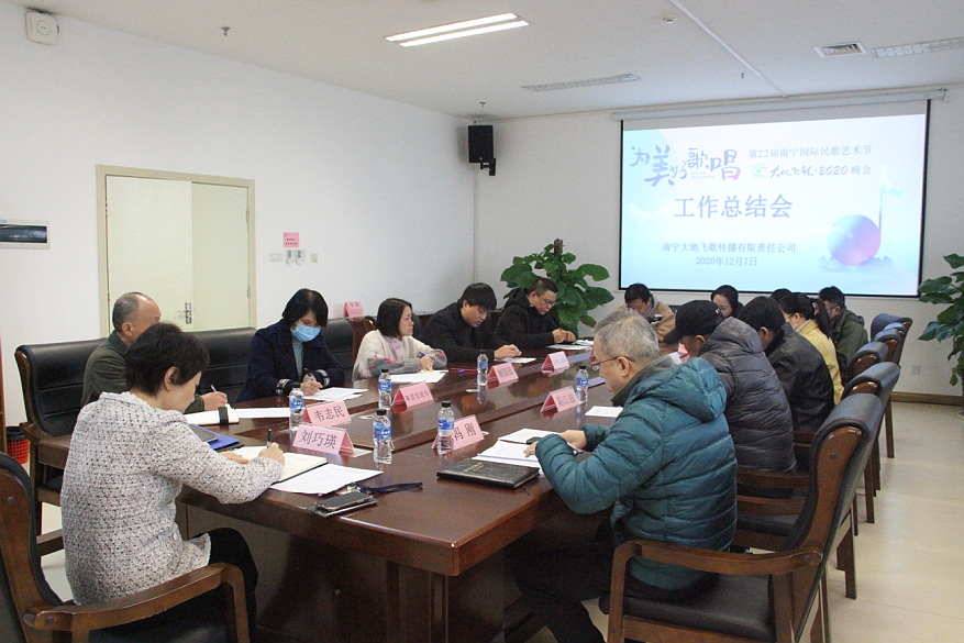 晚会工作总结会现场近日,南宁大地飞歌文化传播有限责任公司召开第22届南宁国际民歌艺术节“大地飞歌·2020”晚会(以下简称“晚会”)工作总结会,对晚会各项工作进行全面梳理总结,并结合当前市场趋势讨论下一年度工作发展计划。集团党委副书记书记、总经理刘巧瑛出席会议。会上,大地飞歌集团公司各部门负责人就晚会各项工作进行了总结,详细分析晚会工作中存在的问题和不足,提出了意见建议。同时结合当前市场融合线上线