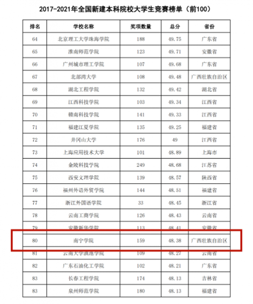 在“2017-2021年全国新建本科院校大学生竞赛榜单”中,南宁学院以48.38分的成绩在同类院校中排名第80位,闯入全国百强!